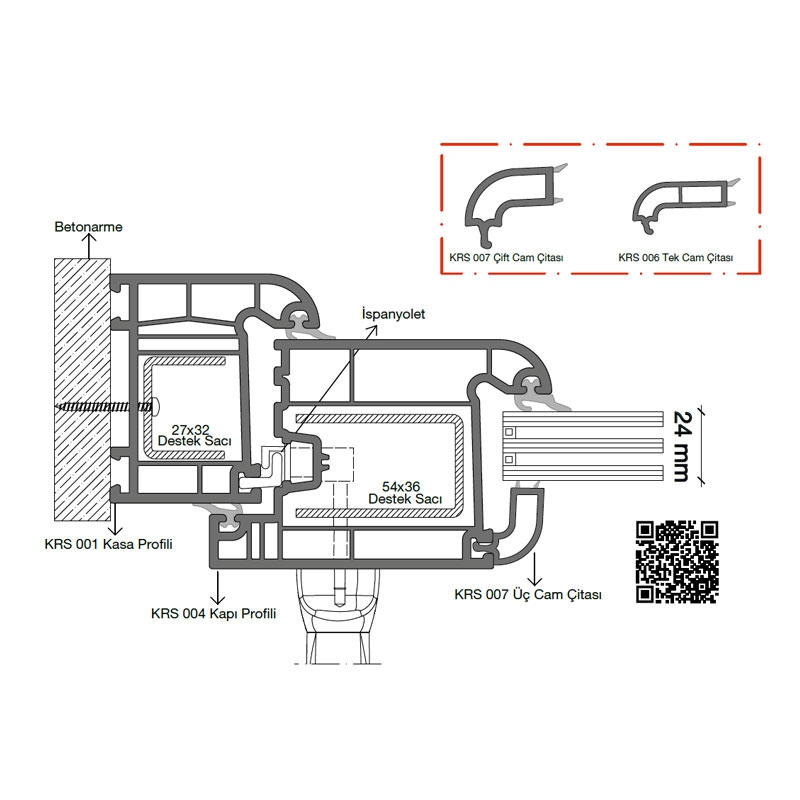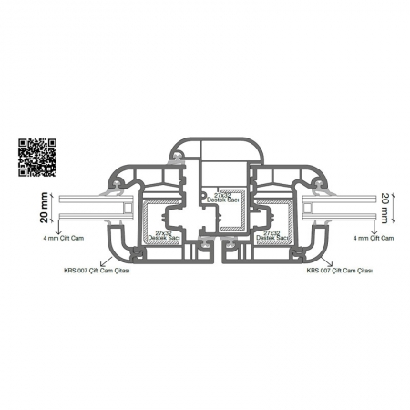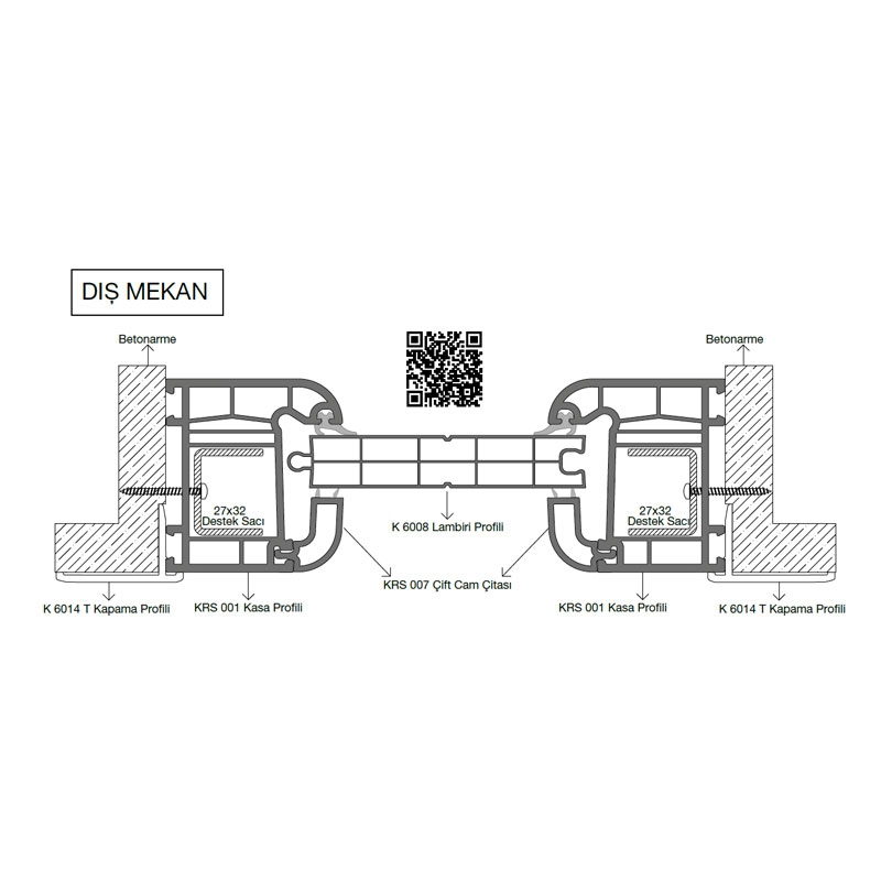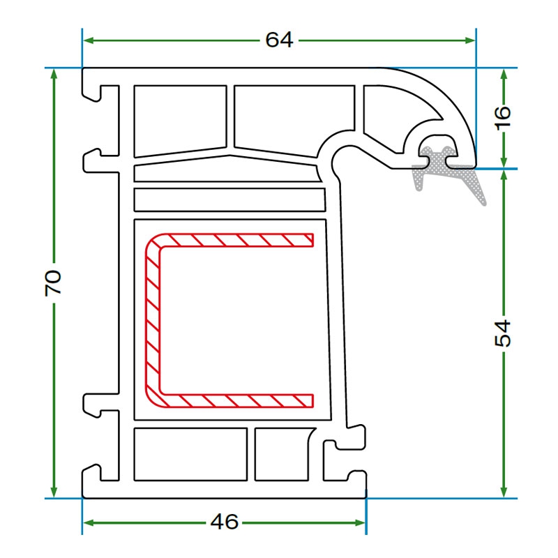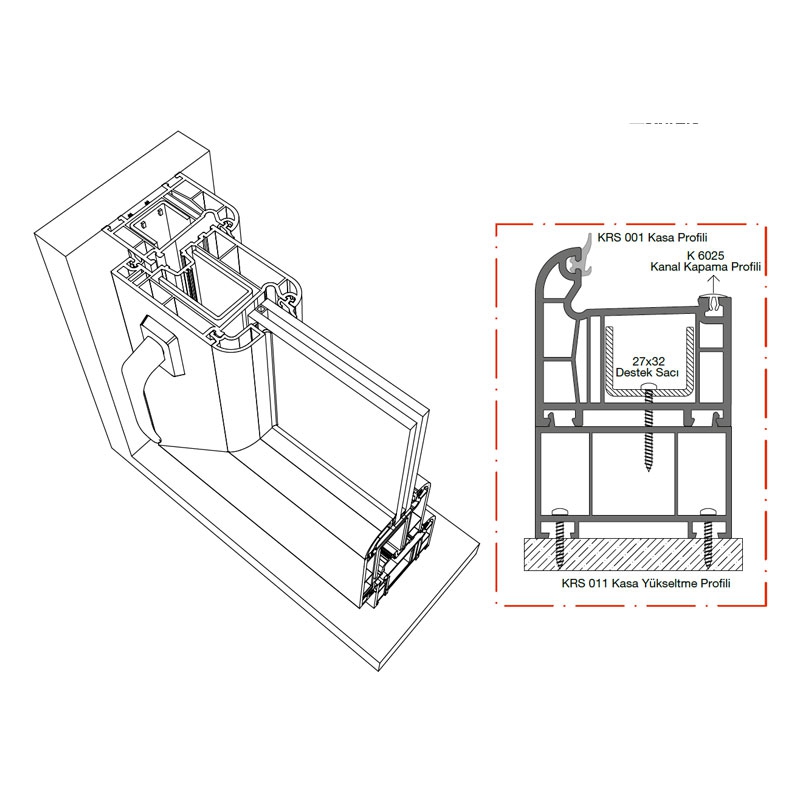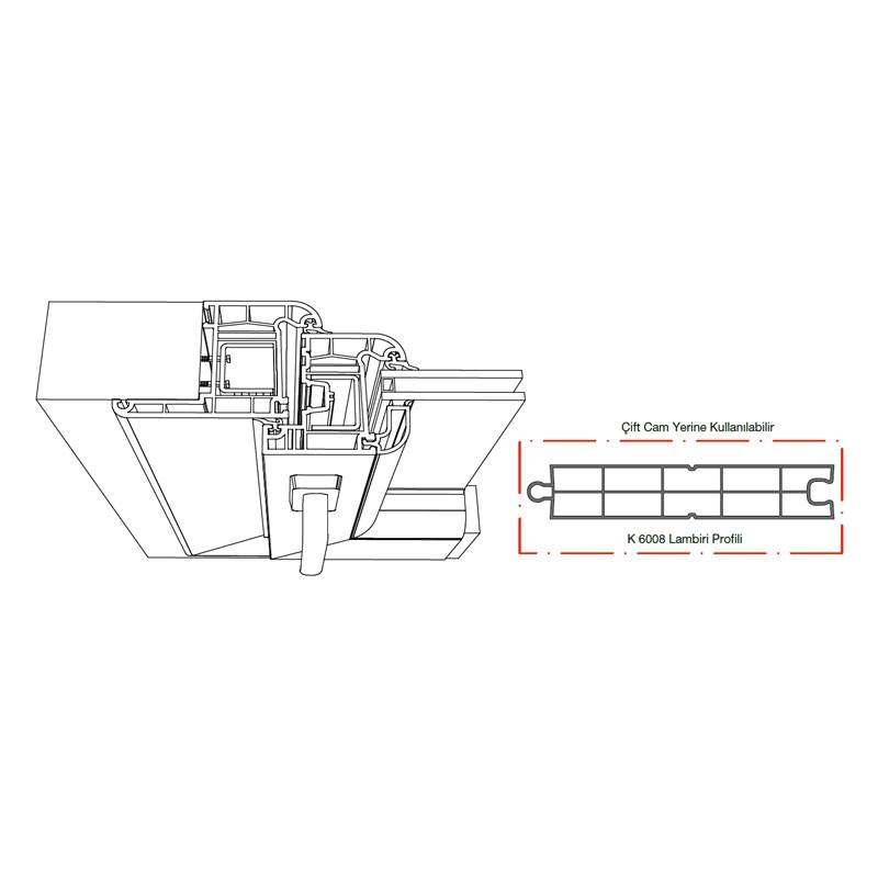 Kasa, kanat ve orta kayıt profillerinde tek tip çelik takviye kullanılır; üretim kolaylığı ve yapısal bütünlük sağlar.