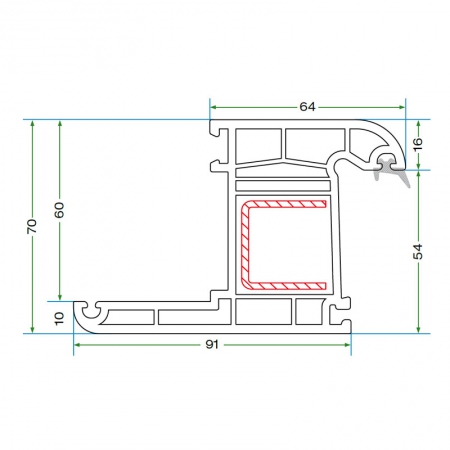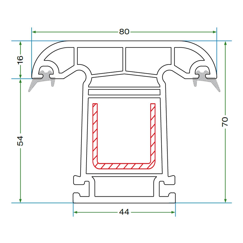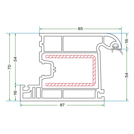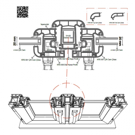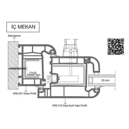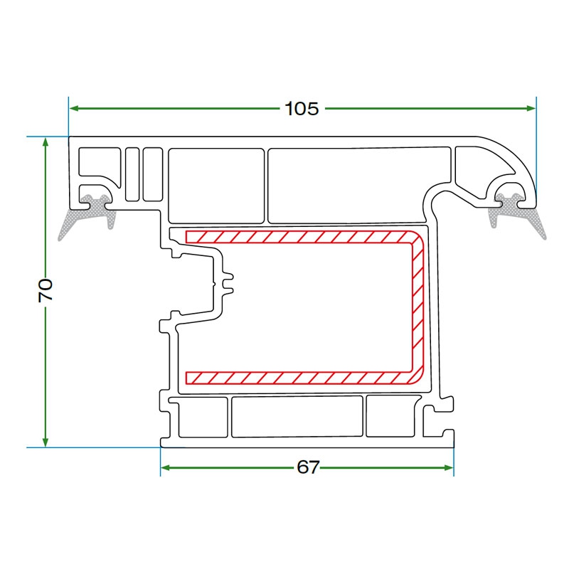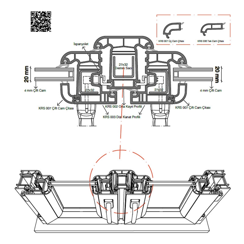 Kasa, kanat ve orta kayıt profillerinde tek tip çelik takviye kullanılır; üretim kolaylığı ve yapısal bütünlük sağlar.